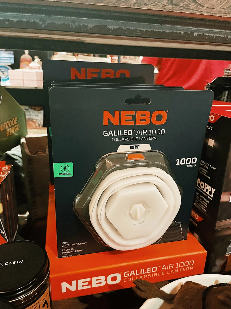 The GALILEO AIR 1000 lantern by NEBO is a USB-C rechargeable, 1000 lumen collapsible lantern with 6 light modes featuring a USB power bank for powering or charging most USB devices. The lantern collapses quickly and easily to be extremely flat and compact for storage or travel and its folding hanging hook provides versatile mounting options.