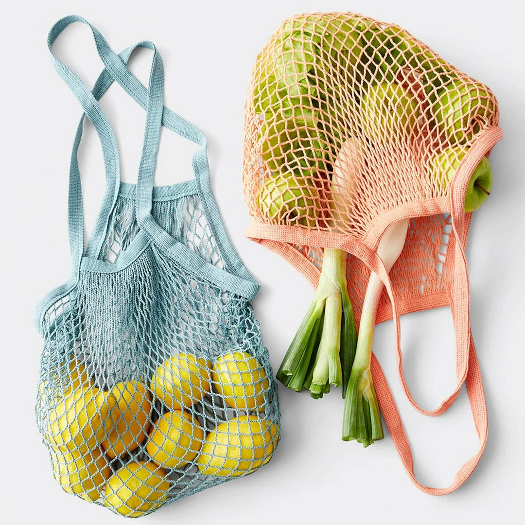 Lightweight and foldable, these totes can be easily kept in your purse or car. The expandable fabric allows it to adjust to the amount of storage needed. 18″W x 14″H. Expandable mesh netting. Cotton. Machine washable