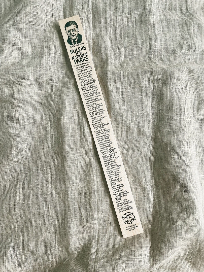Wooden rules with inches & centimeters on one side and “Rulers” of National Parks on the other.