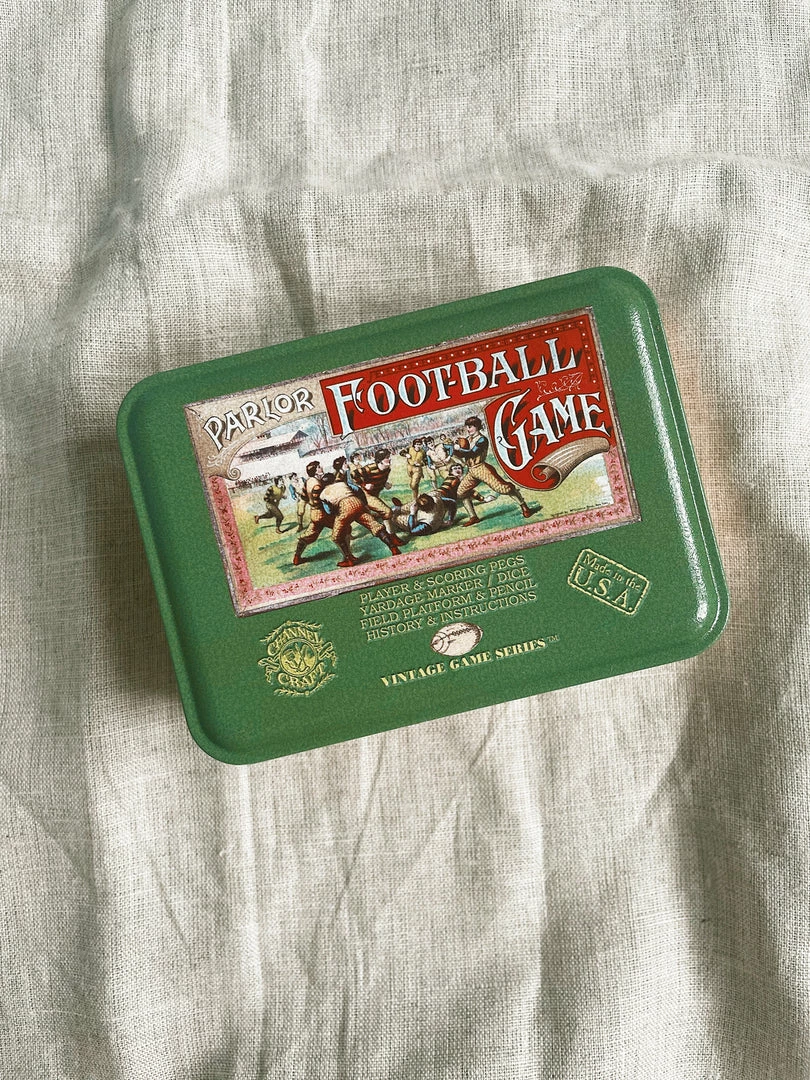 McLoughlin Brothers produced a series of football games starting in the 1890s. Some of them had actual team names such as the Yale Harvard Football Game while others just showed team uniforms. The Parlor Football graphic lithograph on the vintage game tin is an original McLoughlin Brothers box lid in 1890s.
