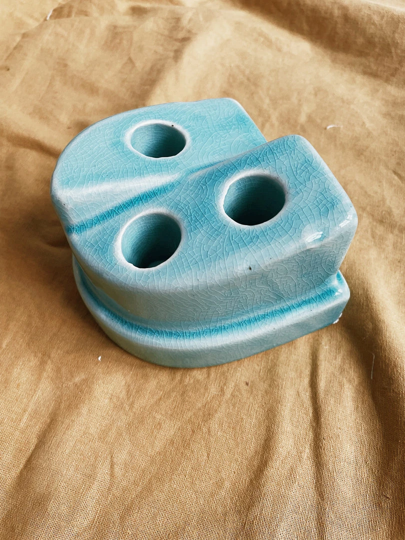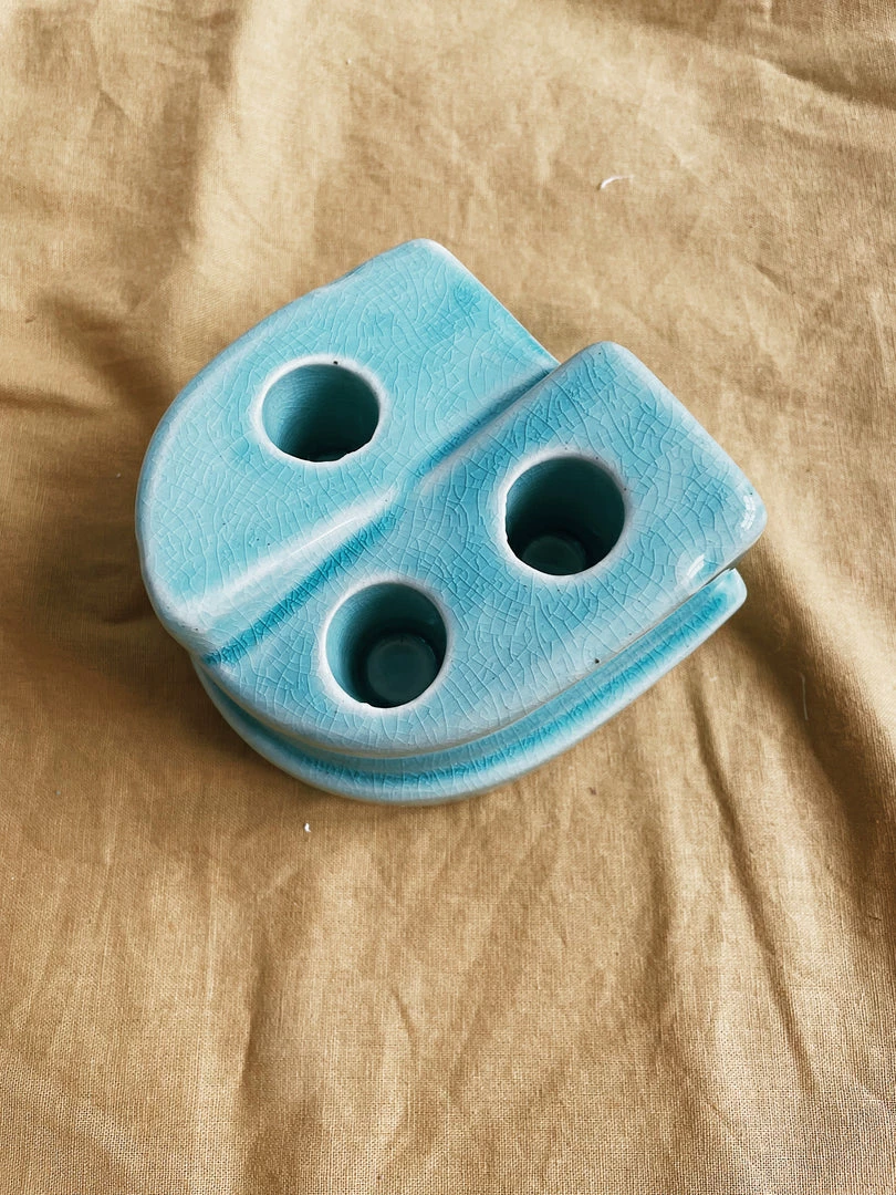 This terra-cotta taper holder with a crackle glaze and gorgeous aqua color is fun and funky. Whether your home is contemporary or an eclectic mix, a candle holder that holds not one but three taper candles is a must-have show-stopping accent to your decor.