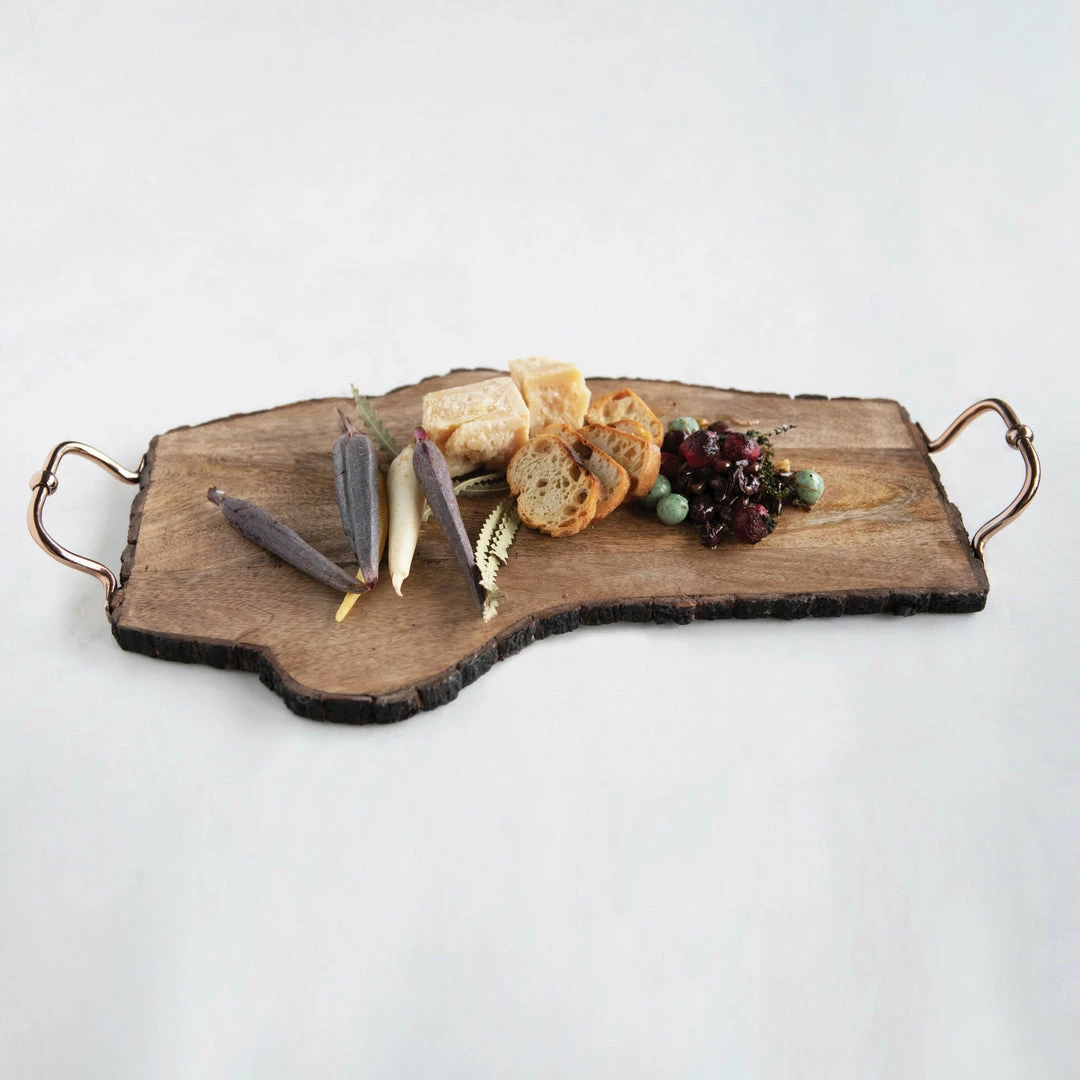 This uniquely shaped serving tray is the perfect piece for people that love hosting. With an asymmetrical shape, this tray is made out of mango wood and is perfect for serving cheese or meats in style.