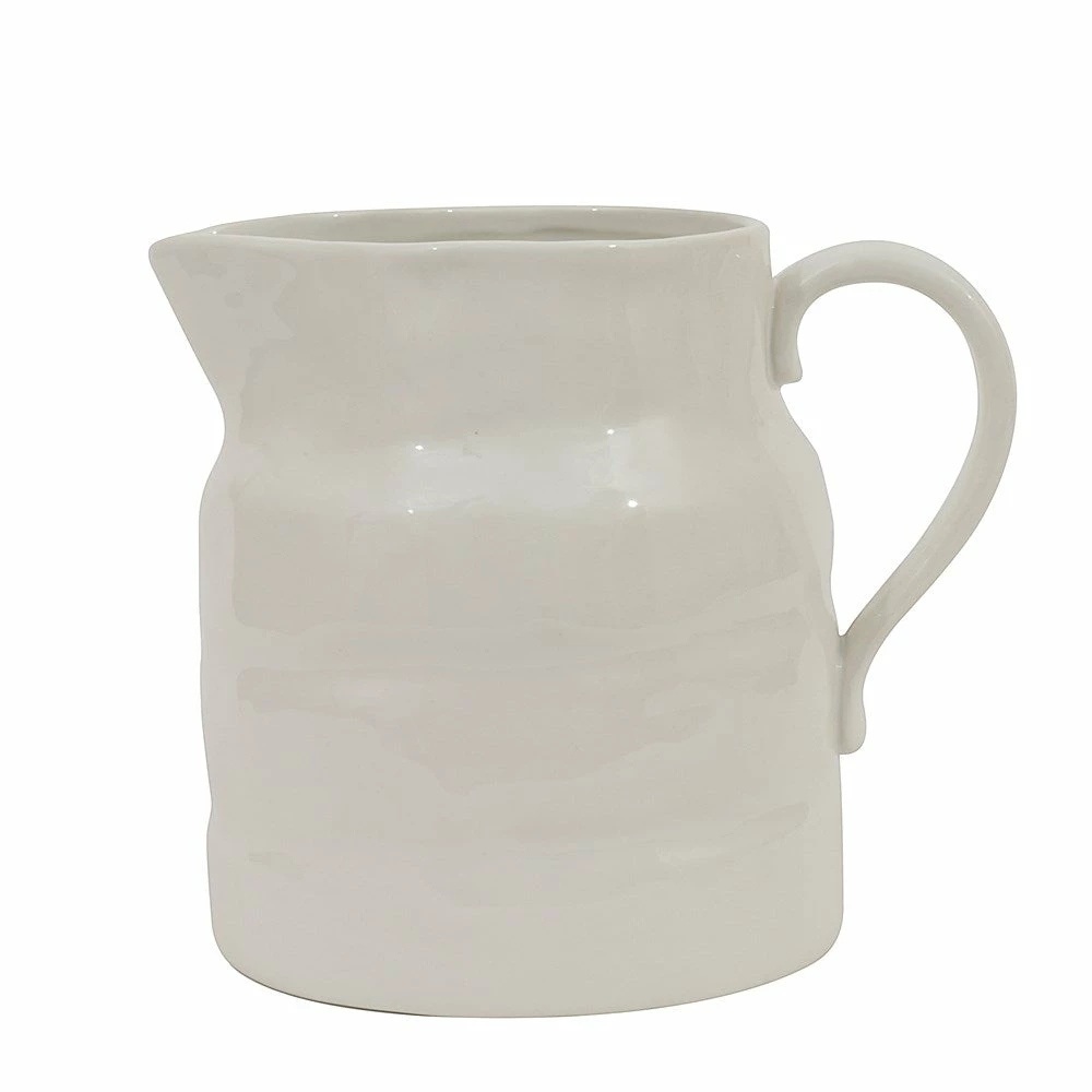 The vintage style of this white pitcher makes it a classic for your kitchen. There is a soft ripple design throughout. The spout has a V shape which allows for controlled pouring of your liquids.