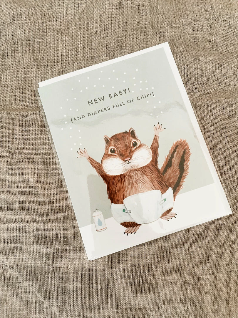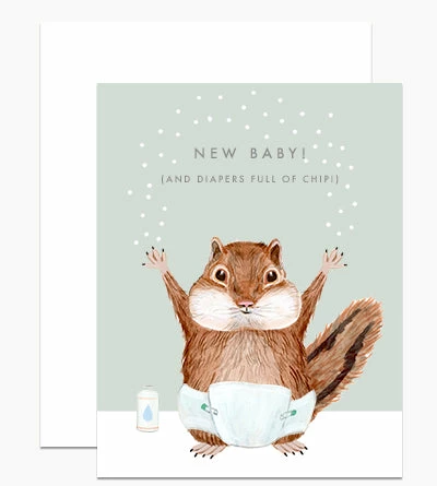 | A baby chipmunk in diapers text reads “New Baby! And Diapers full of Chip!” |