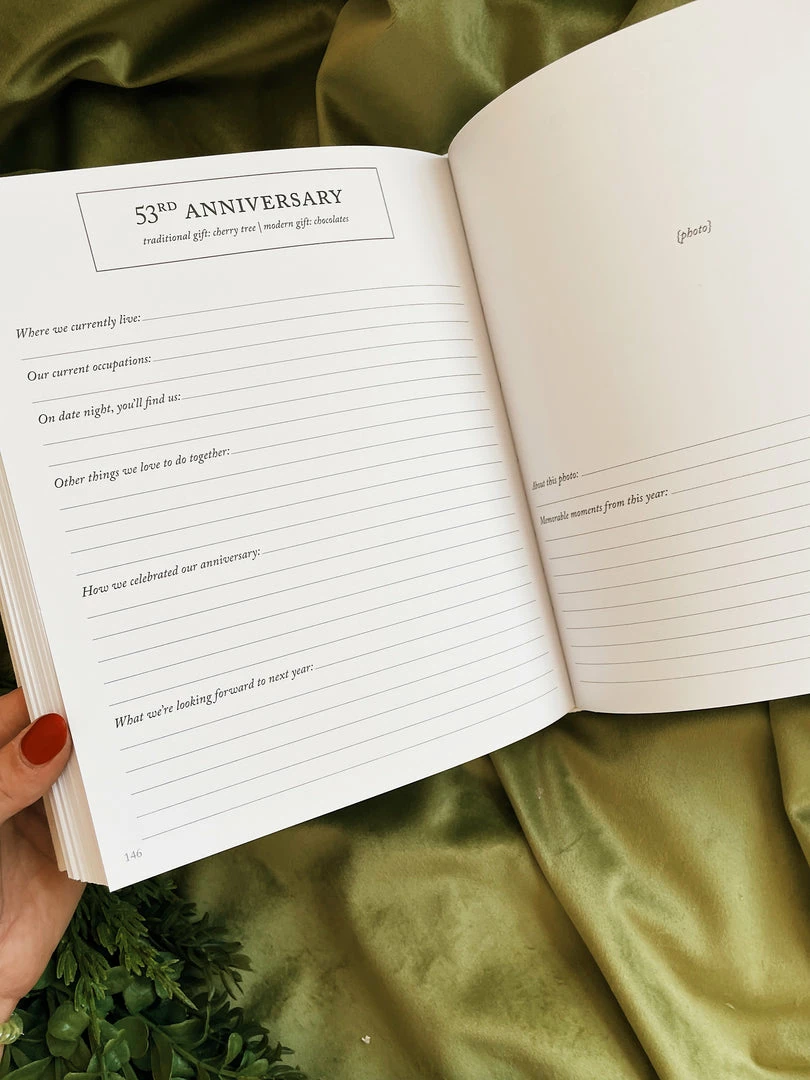 - This keepsake book will help you capture a snapshot of your marriage memories that you will cherish for a lifetime. With simple, guided prompts and space for photos each year, you can watch your love story as it grows and share it with generations to come.