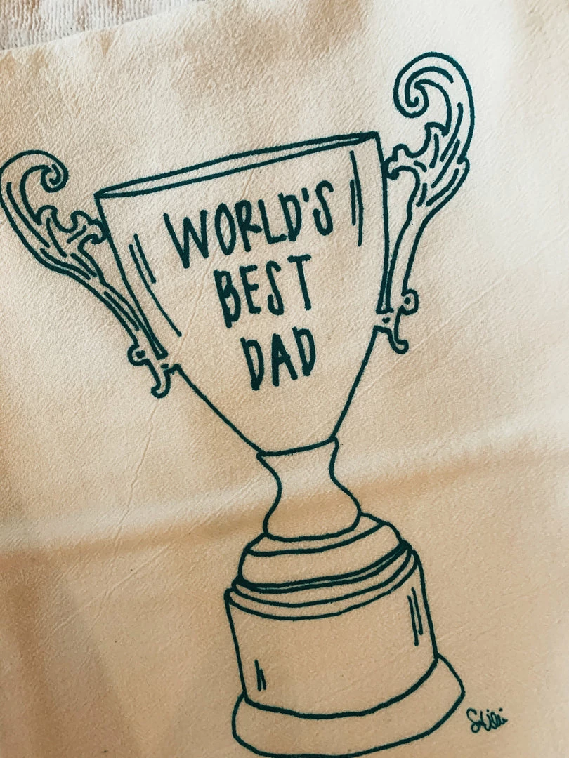A trophy for the World’s Greatest Dad, drawn + screen printed onto washable lint-free floursack cotton kitchen towels. These tea towels only get better as you wash them – perfect for drying dishes or just making your kitchen look awesome. They make a really great gift! Each 100% cotton towel measures approximately 26″ x 26″. Milled + printed in the US on white cotton. Machine washable, tumble dry, iron as needed, but we don’t recommend using bleach.
