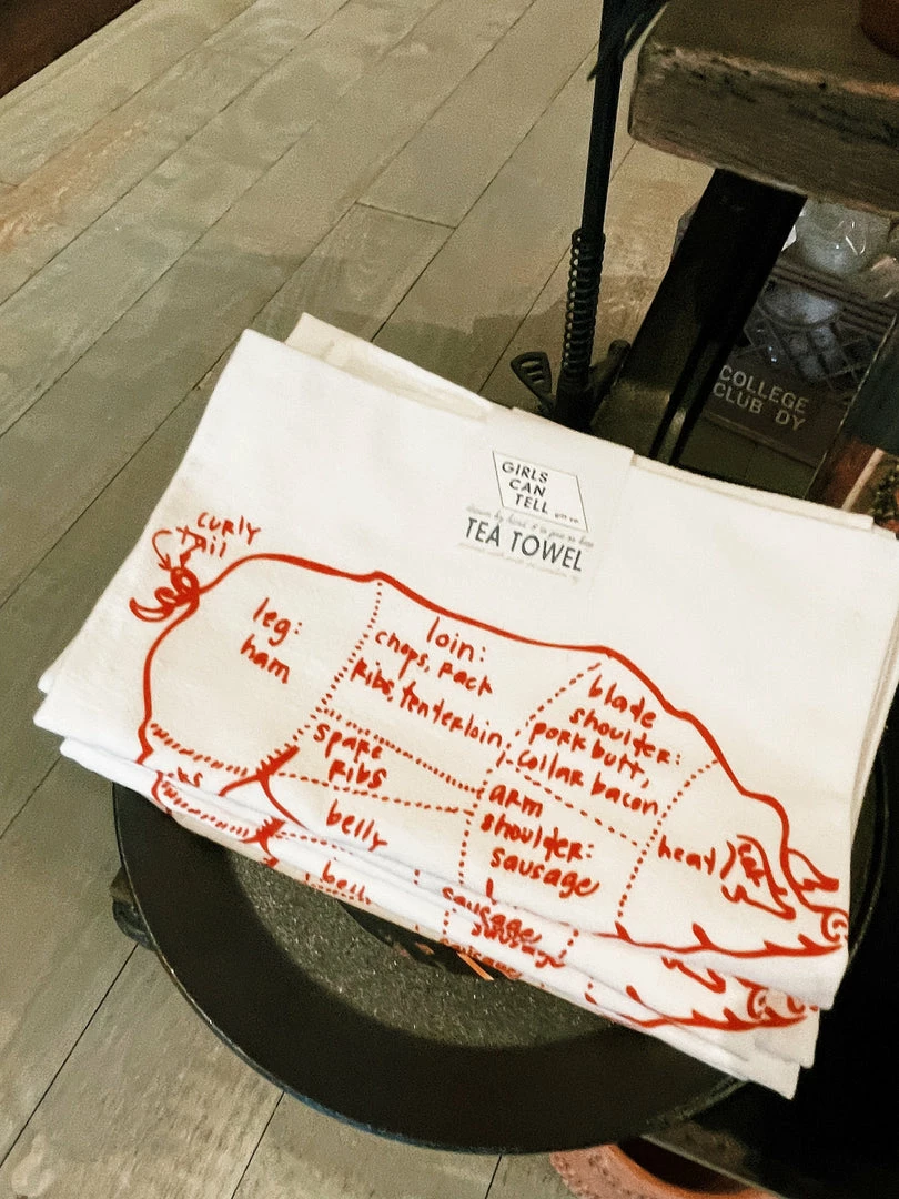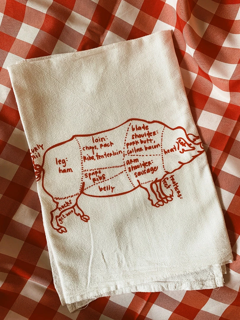 A pig through the eyes of your local butcher, drawn, labeled + screen printed onto washable lint-free floursack cotton kitchen towels.