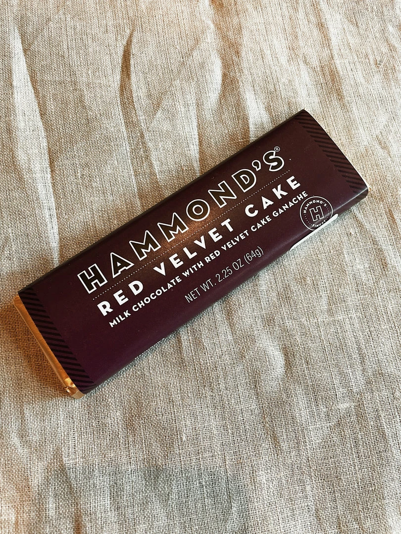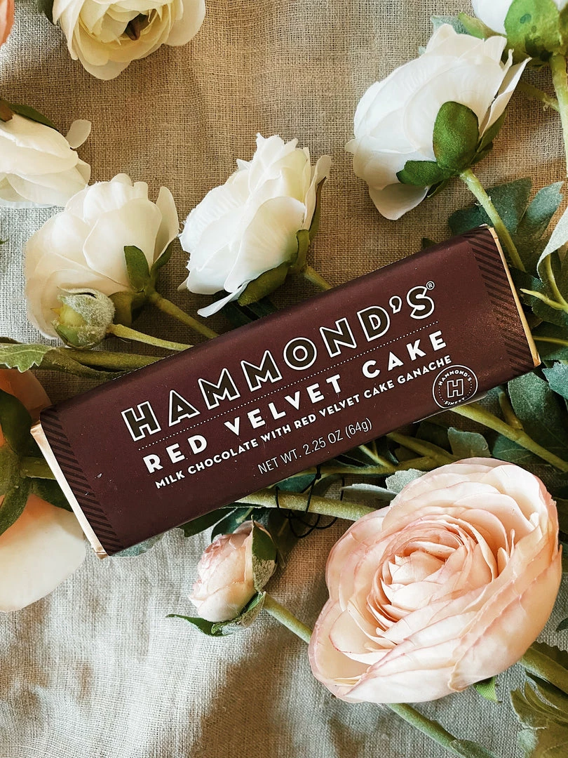 Craving freshly baked cake? Indulge with this decadent Belgian chocolate candy bar filled with a rich, red velvet cake ganache.