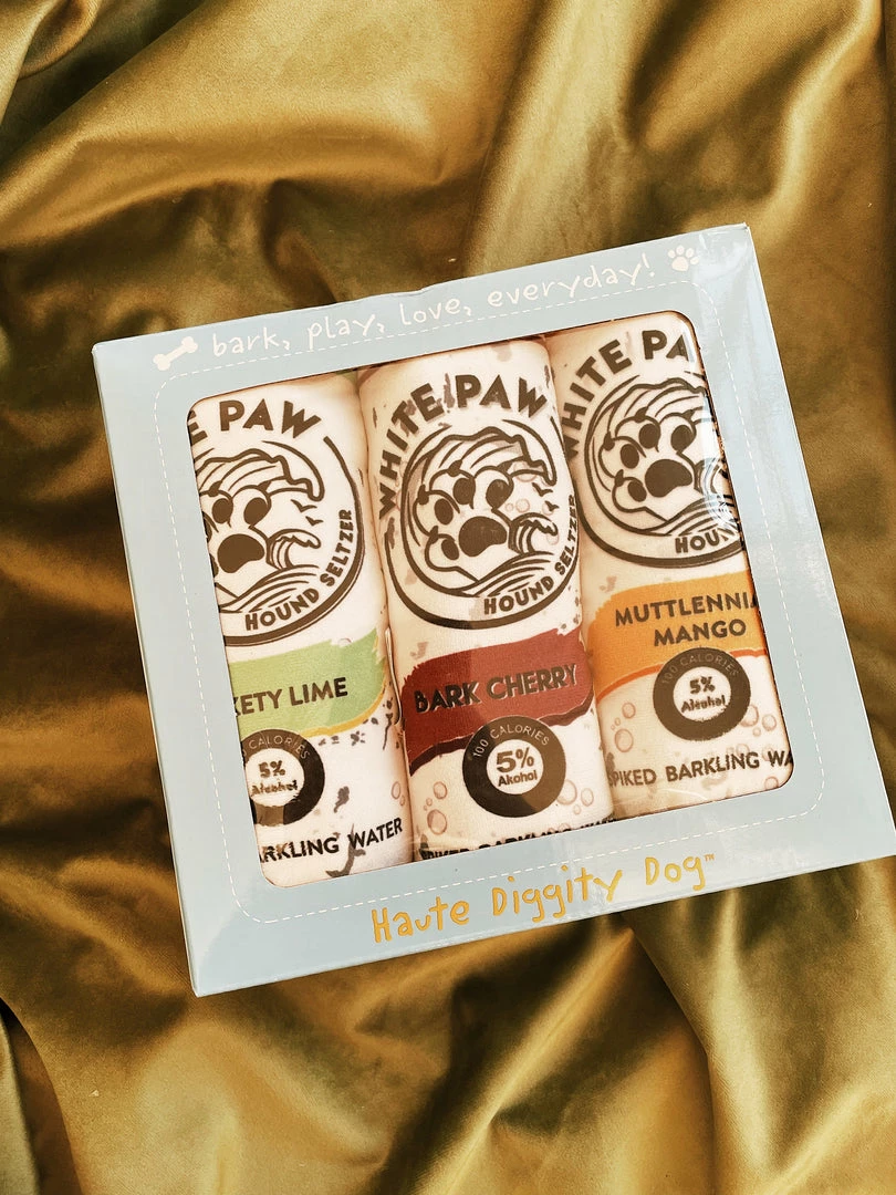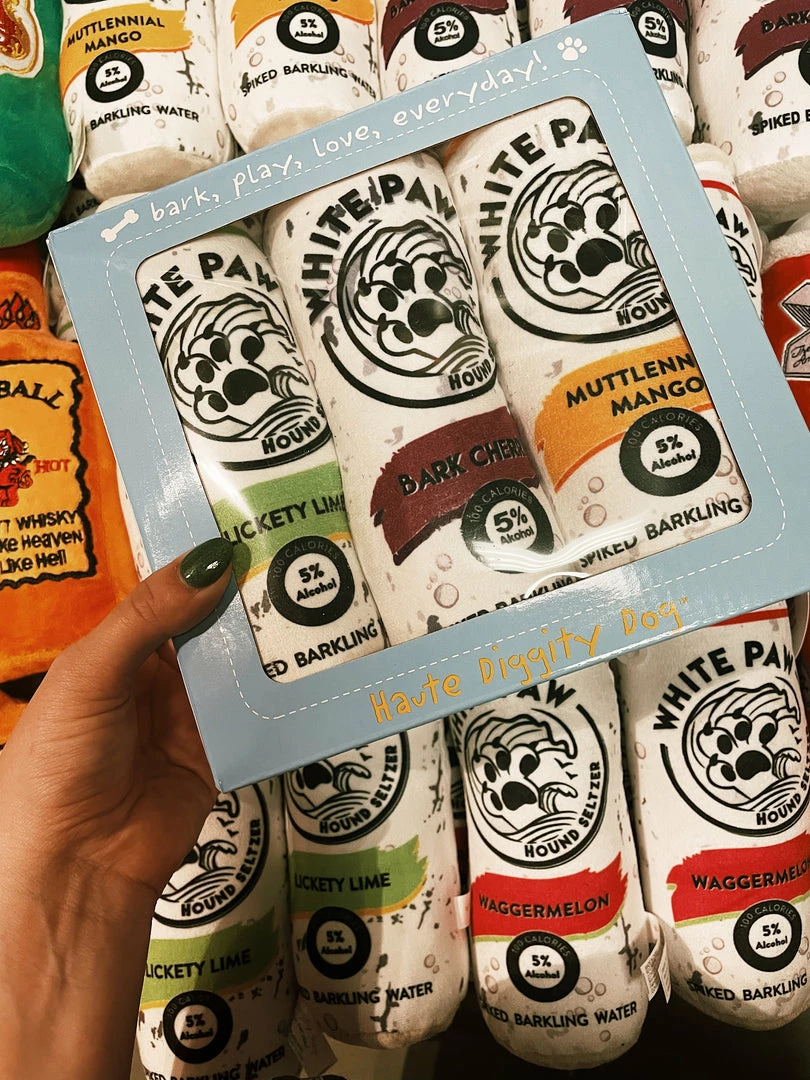 White Paw Hound Seltzer 3 Pack T-R-E-A-T Yourself! New to Haute Diggity Dog, the White Paw 3-pack comes packaged in a very cute branded box ready to gift to your favorite pup, or even for yourself! This pack includes THREE of our most popular toy, White Paw! Featuring Bark Cherry, Lickety Lime, and Muttlenial Mango! Each White Paw is made with soft plush and a fun squeaker inside!