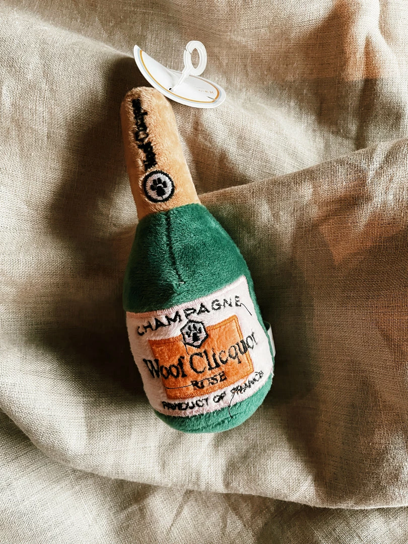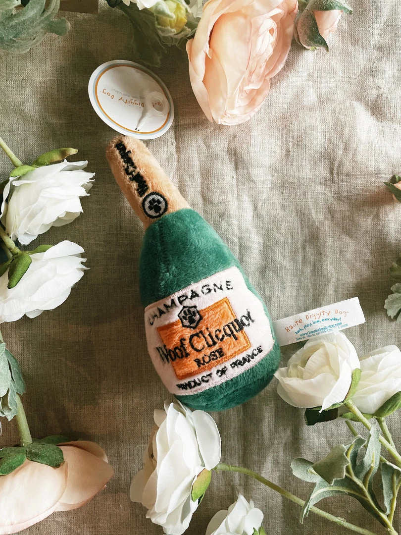 Woof Clicquot Rose’ is the perfect plush dog toy for any occasion. Woof Clicquot champagne bottle has a soft, plush exterior with a squeaker inside that drives dogs crazy. Every pampered pup should have a bottle! Woof Clicquot Rose’ plush dog toy is available in 3 sizes. Choose Small, Large, or XL Woof Clicquot. All X-Large size toys feature a durable mesh lining for aggressive chewers.