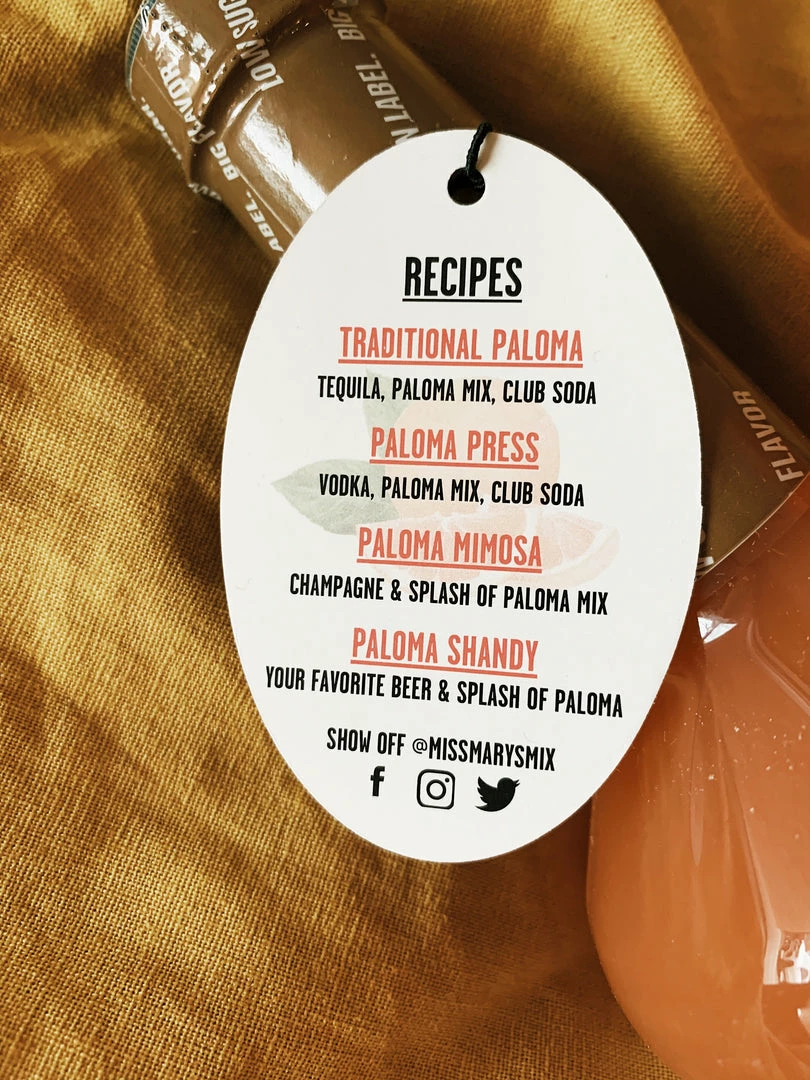 Get excited about your new favorite cocktail with a fresh twist. Our Fresh Squeezed Paloma mix is handcrafted with premium ingredients including Fresh Grapefruit and Lime, Organic Blue Agave Syrup, and bright natural essential citrus oils. Our refreshing and clean Paloma Mix contains only 2g of sugar and with only 40 Calories per serving, it is perfect for any occasion and will leave you craving more. The Perfect Paloma: Combine 2 parts Miss Mary’s Fresh Squeezed Paloma Mix with 1 part premium tequila in a shaker with ice. Add a splash Club Soda for a boost of refreshment. Garnish with a fresh lime wedge. Paloma Press: Combine 1 part Miss Mary’s Fresh Squeezed Paloma mix with 1 part premium vodka and 1 part club soda. Garnish with a fresh lime wedge. Paloma Martini: Combine 1 part Miss Mary’s Premium Paloma Mix with 2 parts premium vodka. Add a splash of dry vermouth. Shake, pour, adore. Paloma Mimosa: Pour a splash Miss Mary’s Premium Paloma Mix into your favorite champagne.