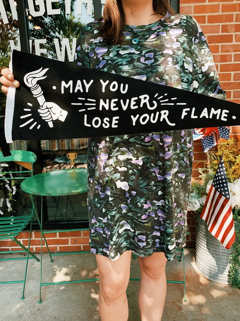 This custom May You Never Lose Your Flame pennant comes care of Daybreaker Collective and reminds you to always push yourself to create everything you wish.
