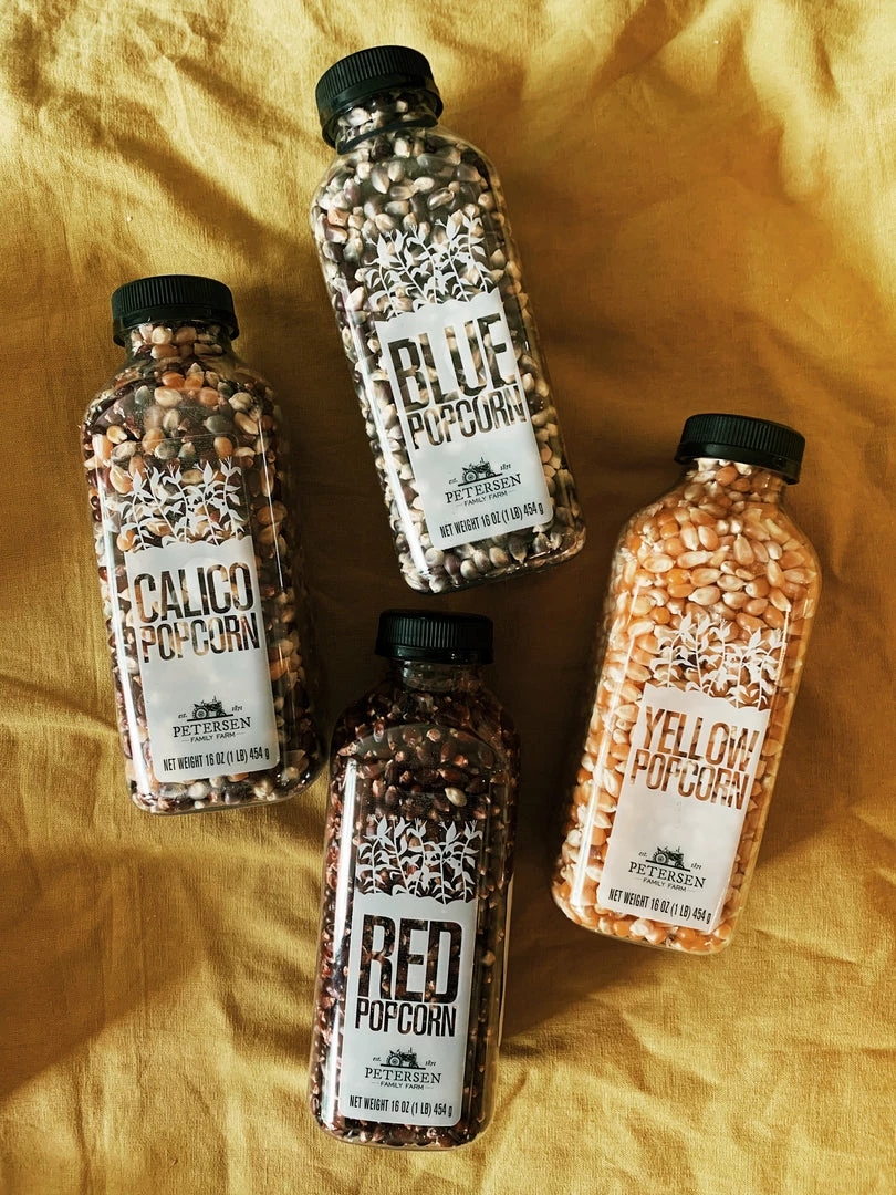 One of our favorite crops is the corn we grow to make our fresh gourmet popcorn. We grow four colors of popcorn that are perfectly dried to create the best popcorn. We offer this product in four different bottles, choose between red, blue, yellow, or calico.