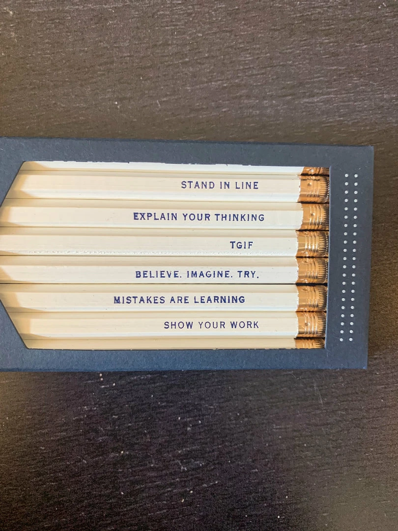 Pencil Phrases : Raise Your Hand, Stand in Line, Explain Your Thinking, TGIF, Believe. Imagine. Try., Mistakes are Learning, Show Your Work, and The Golden Rule.