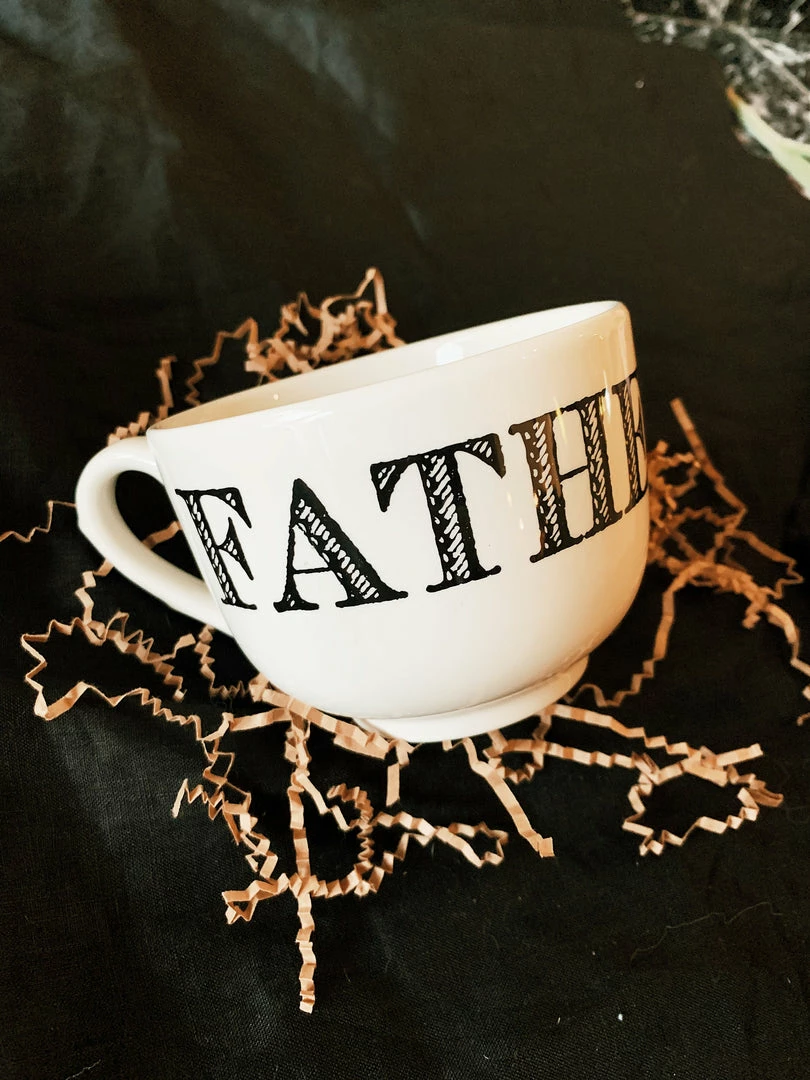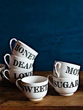Each grand cup in this collection features a different term of endearment set in archival type, with three brushstrokes of hand-applied color on the handle. These earthenware café-style cups are perfect for sipping, but are also large enough to serve a lovingly made soup, some cereal, or a dessert.