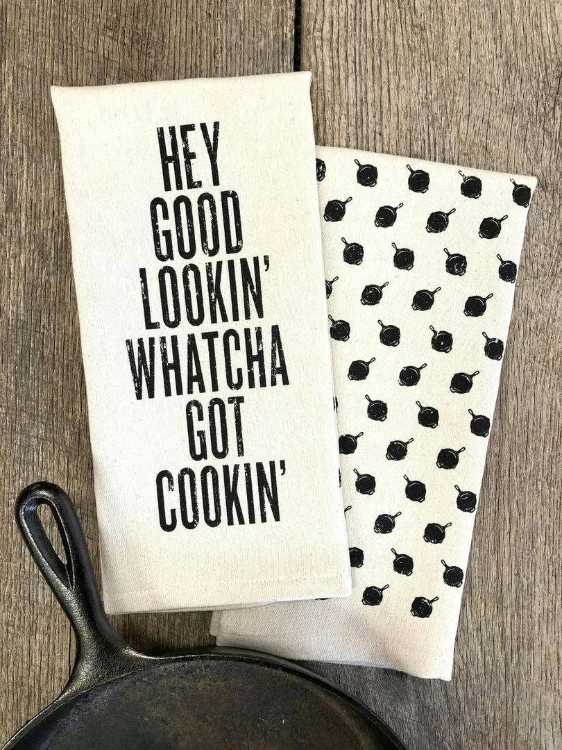 Hey Good Lookin’ Whatcha Got Cookin’ – Kitchen Towel Arguably, the song of southern kitchens everywhere. Distressed black ink surrounded by a pattern of the timeless cast-iron skillets.
