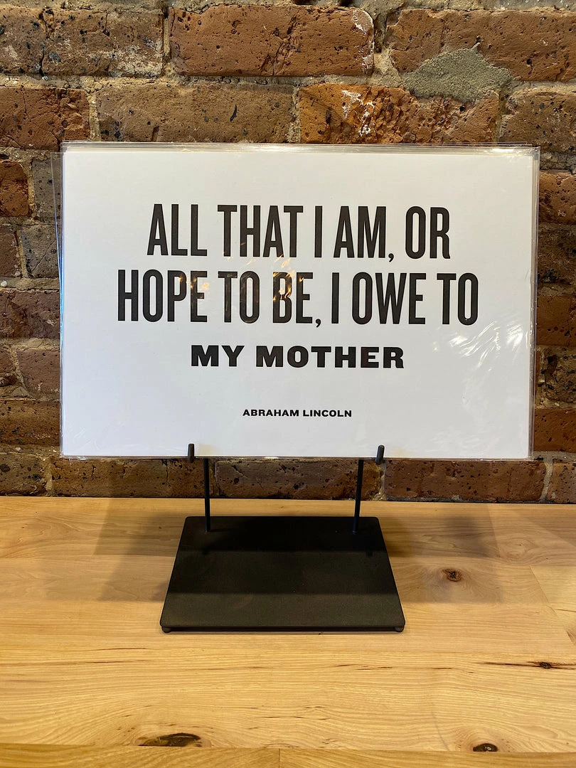 Quote reads, “All that I am. Or hope to be, I owe to my mother.” A quote from the 16th President of the United States, Abraham Lincoln.