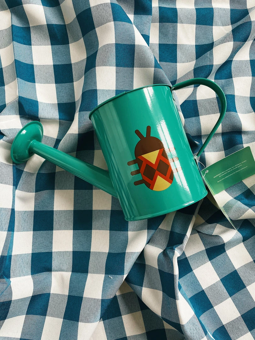 These colorful 5½” tall metal watering cans come in an assortment of orange-red and teal with adorable character art.