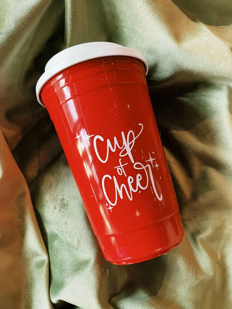 This 15oz plastic tumbler features a snap on lid and fits in most cup holders for easy travel.